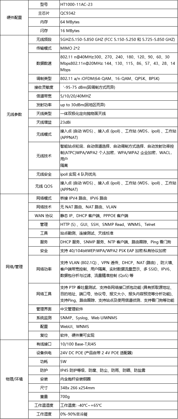 HT1000-11AC-23采用了先进的设计集成2*2 MIMO技术,802.11a/n 5G 工业级、远距离、室外功能强大的无线宽带接入和传输产品。它内置中讯慧通私有协议无线技术,该技术结合了业界领先的核心技术,包括MIMO、BeamForming、TDMA等等,具有传输距离远,吞吐率高,抗干扰性强的特点。 10km高速无线传输,广泛应用于基站通信、森林防火、港口传输、油田监控等场景。专业室外壳设计,适应各种恶劣环境,提供IP66级别防尘防水,即使在极端的高低温(-40度到70度)也能正常稳定工作。
