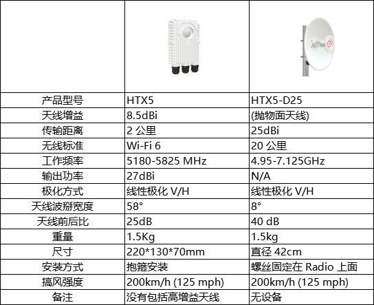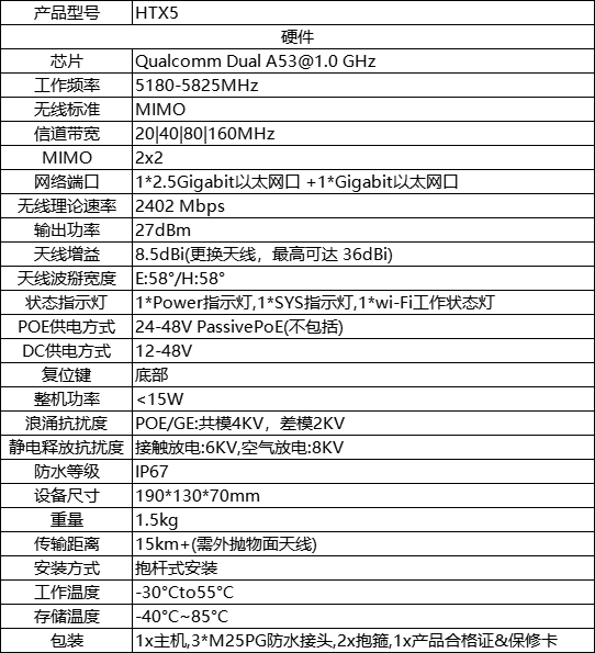 TX5是全新一代802.11AX协议电信级、中远距离、室外功能强大的高带宽无线宽带接入和传输产品。它内置私有协议无线技术,该技术结合了业界领先的核心技术,包括MIMO、BeamForming、TDMA等等,具有传输距离远,吞吐率高,抗干扰性强的特点。拥有业界领先的产品设计,可以提供最高1.7Gbps 吞吐量能力。创新性的兼容和改善了WIFI协议,保障了设备无线传输的高吞吐率,点对点传输以及抗干扰能力。HTX5可以搭配不同功率天线实现 10-30km高速无线传输,广泛应用于基站通信、森林防火、港口传输、油田监控等场景。专业室外壳设计,适应各种恶劣环境,提供IP66级别防尘防水,即使在极端的高低温(-40度到70度)也能正常稳定工作。
